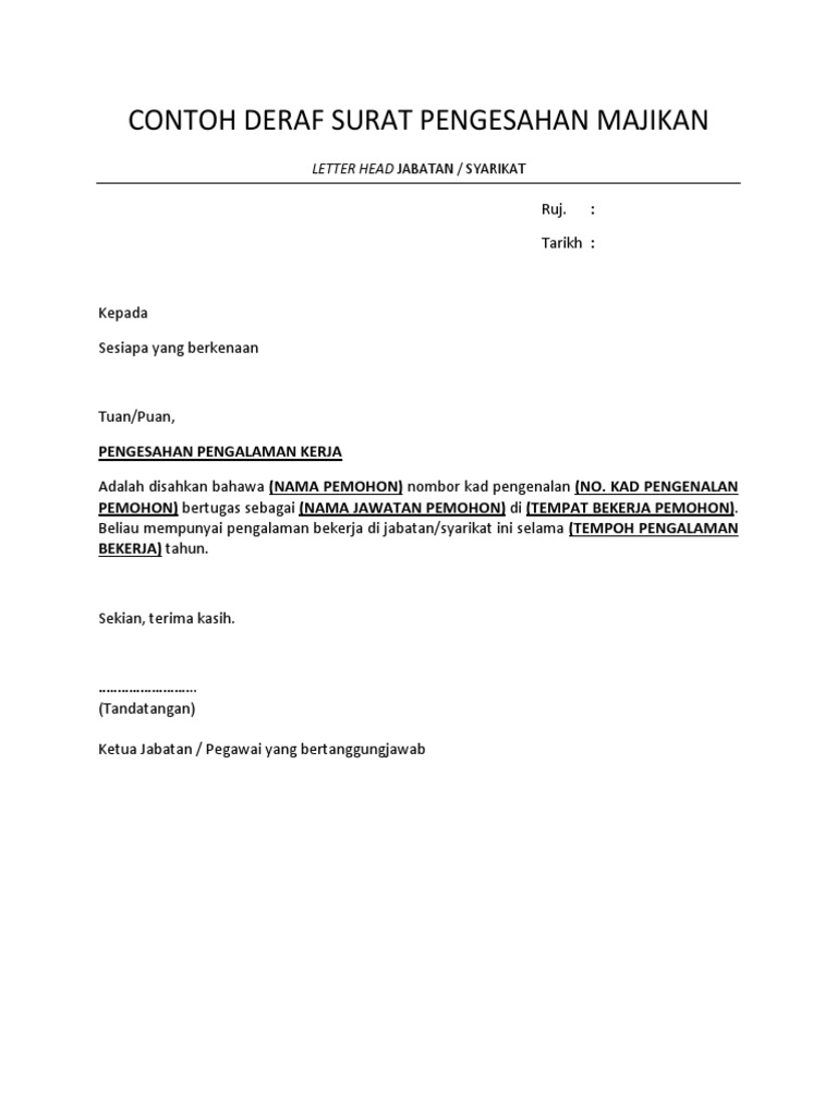 Berikut adalah contoh surat pengesahan majikan sekiranya anda ingin membuat pinjaman bank atau membeli rumah. Contoh surat pemberhentian kerja atau pemutusan hubungan kerja (phk) adalah surat yang dikeluarkan perusahaan atau badan usaha pada karyawan terpilih. Surat pengesahan majikan sangat penting untuk sebarang urusan rasmi seperti loan bank serta gaji pokok. Pengurus abc sdn bhd, 06000 alor setar, kedah darul aman. Kepada pengurus cawangan bank pertanian malaysia berhad tuan, perakuan / pengesahan majikan encik/cik/puan : Surat pengesahan pekerjaan, yang juga dipanggil bukti surat penggajian, adalah dokumen bertulis yang memberikan pengesahan majikan yang boleh disediakan dengan mencetak maklumat gaji ytd dari sistem penggajian anda. Format surat pengesahan majikan tempoh pengalaman contoh. Umkm (1) slip gaji (3) slip gaji karyawan (1) soft skill (1) struktur organisasi kelas (1) struktur pengesahan majikan by sudirman saad 35211 views. Koleksi contoh surat pengesahan majikan & jawatan. Surat dari saudara tanggal 14 april 2018 dengan nomor 98/iii/2018 beserta contoh kain yang ditawarkan telah kami terima dengan baik. Koleksi contoh surat pengesahan majikan (pelbagai tujuan). Surat kuasa ini berlaku dari tanggal 1 s.d. Anda perlu memohon surat pengesahan daripada pihak majikan sebagai bukti atau butiran yang mengesahkan jawatan anda di sesebuah.